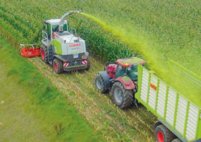 Mit modernster Technik bieten wir effiziente Gras- und Maisernte an, einschließlich Silotransport und -verteilung.